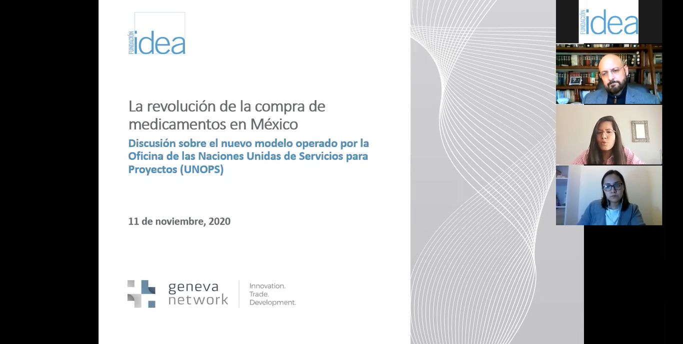 In November 2020, Geneva Network and Fundación IDEA organised the webinar “The revolution of the purchase of medicines in Mexico: Discussion on the new UNOPS Model”, featuring Luis Guillermo Ibarra, expert in drug regulation and former General Director of Biological and Reactive Laboratories of Mexico (BIRMEX); Judith Méndez, researcher at the Center for Economic and Budgetary Research (CIEP); and Karina Flores, an expert in competition law and an official of the Federal Commission on Economic Competition (COFECE). The session was moderated by Carolina Agurto, partner at Fundación IDEA. The session had 78 attendees from the private sector, government and civil society.