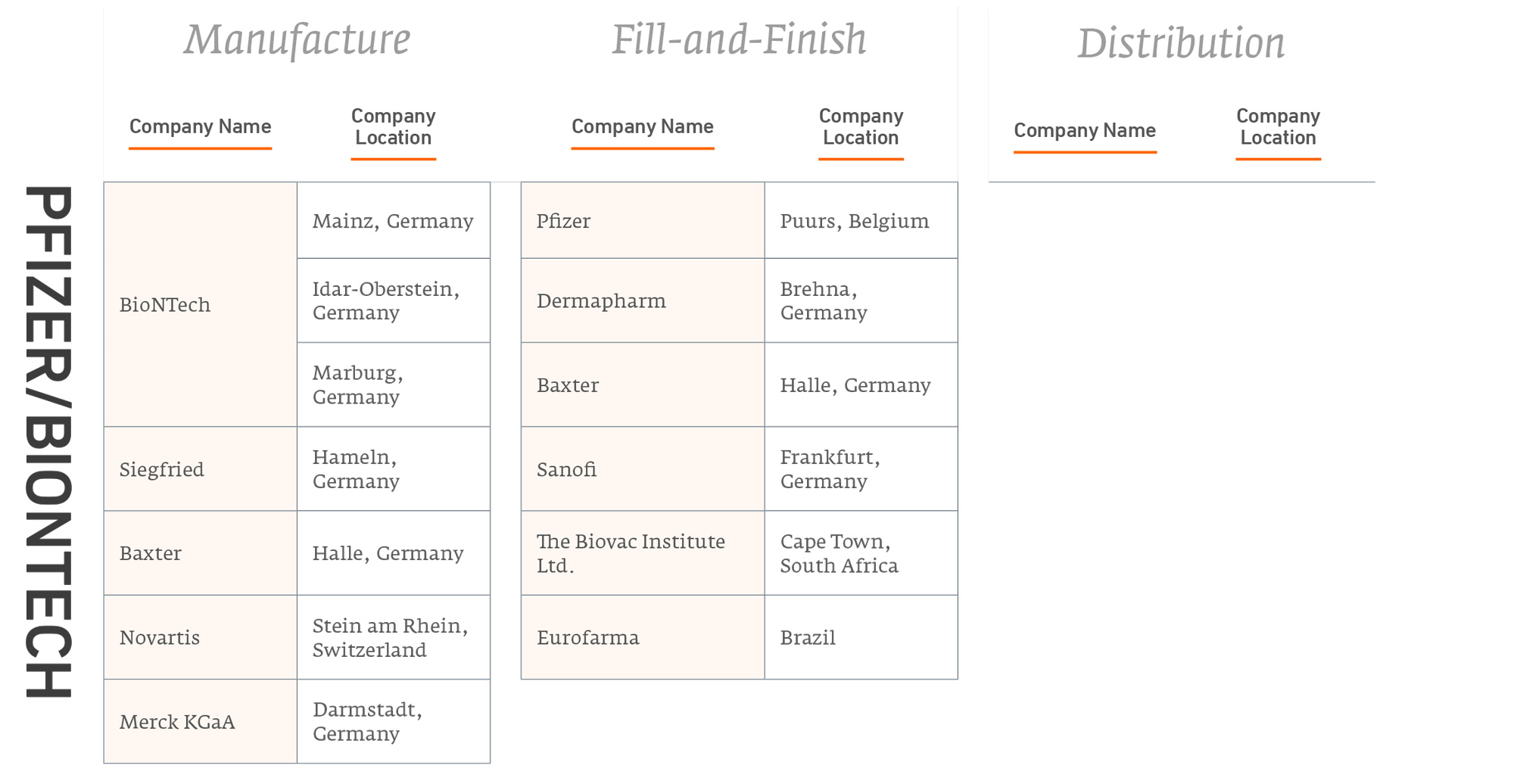 [36] Park, Alice, and Aryn Baker. “Exclusive: Inside the Facilities Making the World’s Most Prevalent COVID-19 Vaccine.” Time, April 19, 2021. https://time.com/5955247/inside-biontech-vaccine-facility/. Neubert and Scheitz, “Exploring the Supply Chain of the Pfizer/BioNTech and Moderna COVID-19 Vaccines.”