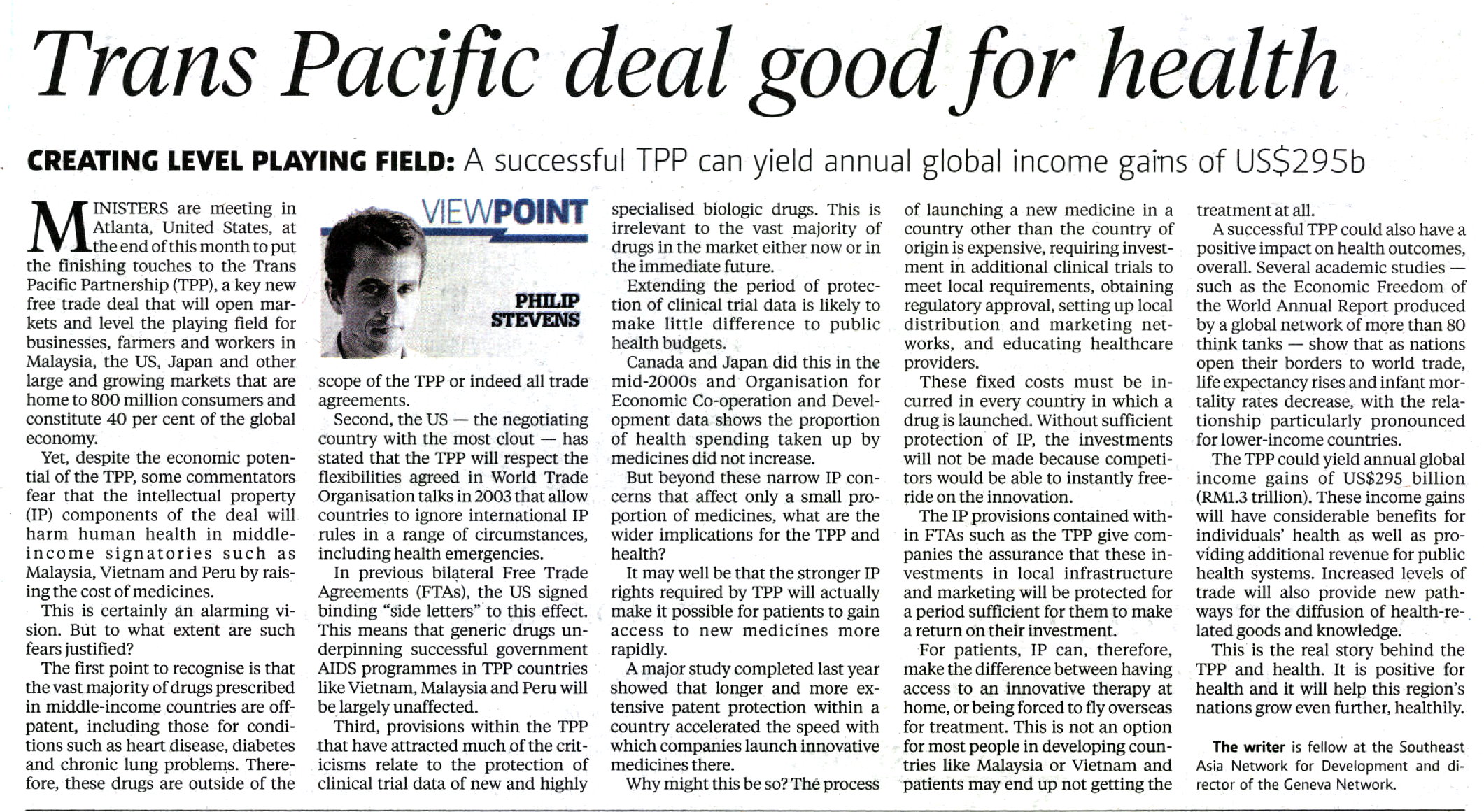 The real story behind Trans Pacific Partnership trade deal is largely positive, writes Philip Stevens Post navigation Previous Article Previous Article Do pharmaceutical tariffs make sense? Next Article Next Article How lower tariffs can save lives Leave a comment Cancel reply Save my name, email, and website in this browser for the next time I comment.